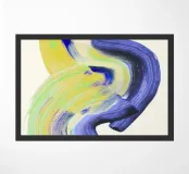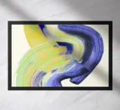 Aquarellähnliche Farbspritzer spritzen auf ein starres Raster. Die beiden Schichten überlagern sich, ohne sich zu vermischen, und schaffen so einen visuellen Dialog zwischen organischer Spontaneität und strengem Rahmen. Ein himmlisches und zugleich architektonisches Bild.