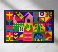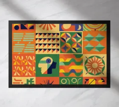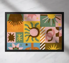 Eine kühne und energiegeladene abstrakte Komposition mit einem Gitter aus bunten geometrischen Mustern. Die lebendige Mischung von Formen, von Sonnen bis zu Schachbrettmustern, schafft ein fröhliches und dynamisches visuelles Fest.