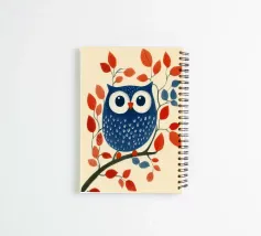 The picture shows a stylised blue owl with large, round eyes sitting on a branch. The owl is decorated with white, feather-like patterns, while the branch is adorned with red and blue leaves. The background is a soft cream colour, which highlights the bold colours of the owl and leaves. The style is playful and graphic, with clear shapes and a charming, almost fairytale-like character.