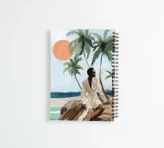 Graceful digital painting of a confident woman in a flowing white robe seated on a rocky beach with palm trees and a vibrant orange sun. This stylish, serene coastal scene evokes luxury, calm, and tropical vibes. Perfect for fashion lovers, modern art enthusiasts, and tropical home decor. Adds sophistication and warmth to living rooms, bedrooms, or offices. Ideal gift for art collectors and fans of contemporary portraiture with a beach-inspired theme.