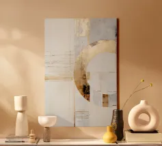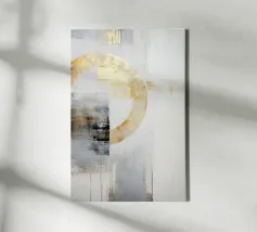 Dieses Kunstwerk ist eine abstrakte Komposition im Panoramaformat, die sich durch eine dynamische Mischung aus Texturen, Farben und geometrischen Formen auszeichnet. Konzentrische goldene Kreise erzeugen ein Gefühl von Bewegung und Tiefe. Die Textur ist reichhaltig, mit sichtbaren Pinselstrichen und Farbschichten, die eine besondere Atmosphäre schaffen. Das Zusammenspiel von Grün- und Erdtönen mit metallischen Akzenten verleiht dem Werk eine harmonische und zugleich lebendige Energie.