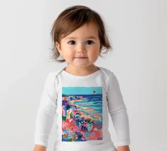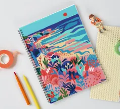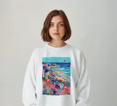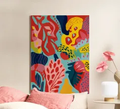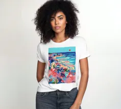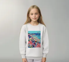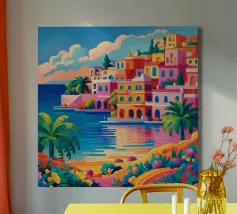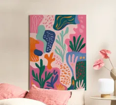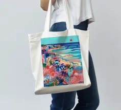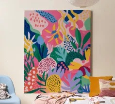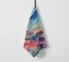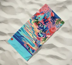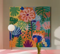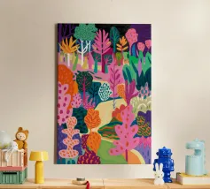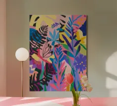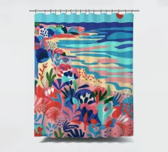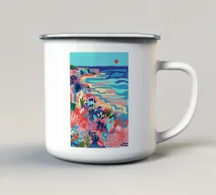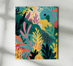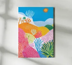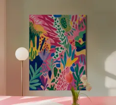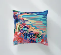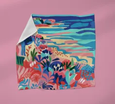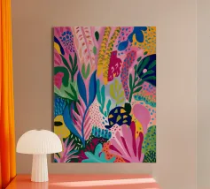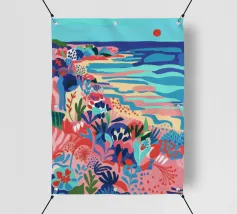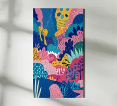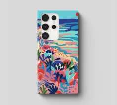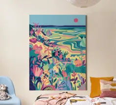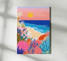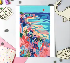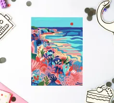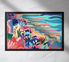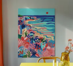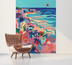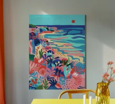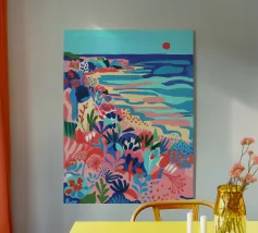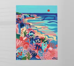 Eine abstrakte, lebendige Küstenlandschaft, in der das Meer ein Strudel aus blauen, rosafarbenen und orangefarbenen Wellen ist, die gegen eine Küste voller stilisierter, bunter Blätter schlagen.