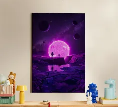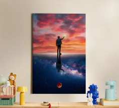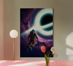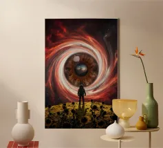 Tauchen Sie ein in eine atemberaubende kosmische Reise mit diesem lebendigen Sci-Fi-Kunstwerk, das eine einsame Silhouette zeigt, die über einem glühenden Raum-Zeit-Gitter steht, das sich zu einem hypnotisierenden Strudel windet. Darüber erhellt ein explosiver Nebel in schillernden Blau-, Grün- und Violetttönen das Universum, umgeben von Erde, Mars und einem strahlenden Mond. Dieses Design ist eine Mischung aus Surrealismus, Astronomie und futuristischer Geometrie - perfekt für Träumer, Weltraumliebhaber und Sammler moderner Kunst, die ein kühnes, inspirierendes Kunstwerk suchen.
