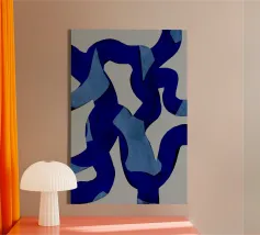 Kühne, ineinander greifende Striche in Blau, Weiß und Schwarz bilden eine abstrakte Komposition vor einem neutralen Hintergrund. Die sich überschneidenden Formen und dynamischen Linien vermitteln ein Gefühl von Bewegung und Energie.