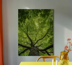 Eine Nahaufnahme der üppig grünen Äste und Blätter eines prächtigen, uralten Walnussbaums, aufgenommen und gespiegelt, um eine symmetrische, horizontale Komposition zu schaffen. Der Spiegeleffekt verwandelt die natürliche Szene in eine majestätische, fast unwirkliche Landschaft, die den Betrachter in ein Paralleluniversum einlädt, in dem die Erhabenheit der Natur unendlich und surreal erscheint. Dieses Kunstwerk eignet sich perfekt für moderne Wohnräume, Kreativstudios, Galerien oder Cafés und verleiht jedem Raum einen ruhigen, inspirierenden und anspruchsvollen Touch.