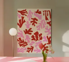 Modern gestaltetes Leopardenmuster in starken, trendigen Kontrastfarben. Rot, Pink und Abricot. Manche Produkte haben ein Herz mit diesem Muster.