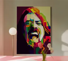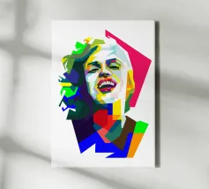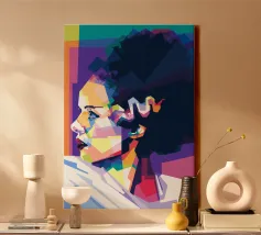 Ein lebhaftes und geometrisches Porträt von Sinead O'Connor im WPAP-Stil mit kühnen, kantigen Formen und einer auffälligen Reihe heller, kontrastreicher Farben. Das Kunstwerk fängt ihre ikonischen Merkmale, wie ihren rasierten Kopf, ihre stechenden Augen und ihren starken Gesichtsausdruck, mit scharfen, fragmentierten Farbblöcken ein. Die Komposition betont Tiefe und Emotionen und behält gleichzeitig die unverwechselbare kubistische Pop-Art-Ästhetik von WPAP bei, wodurch eine visuell dynamische und moderne Hommage an die legendäre Sängerin entsteht.