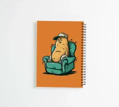 Cartoon illustration of a potato character wearing a cap, comfortably lounging on a green armchair against a vibrant orange background. The relaxed pose and expressive details convey humor and laziness in a lighthearted design.