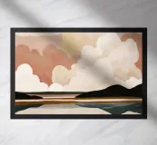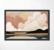 Eine minimalistische, abstrakte Landschaft aus weichen Wolkenformen und subtilen Reflexionen in gedämpften, neutralen Farbtönen.
