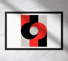 A bold Bauhaus-inspired abstract design featuring layered red circles and rhythmic black vertical lines. A striking modern statement piece perfect for contemporary interiors.