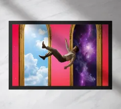 Dieses surreale Kunstwerk zeigt zwei gewandete Gestalten, die Hand in Hand durch einen alten steinernen Torbogen auf einen leuchtenden Himmel in rosa und violetten Tönen zugehen. Über ihnen schwebt ein leuchtendes geometrisches Auge, das Bewusstsein, Geheimnis und tieferes Verständnis symbolisiert. Die Mischung aus historischer Architektur, sanften Farben des Sonnenuntergangs und symbolischer Ikonografie schafft eine Szene voller Bedeutung und Fantasie. Ideal für Fans spiritueller Kunst, surrealer Geschichten und nachdenklich stimmender Wanddekoration, die zu Neugier und Nachdenken anregt.