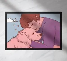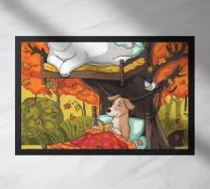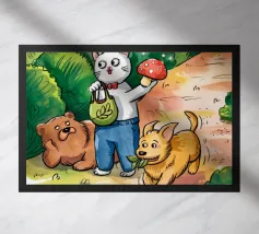 Dieses Kunstwerk zeigt eine mürrisch aussehende Wolke mit einer Gedankenblase, die einen Vogel und einen Bären enthält. Die humorvolle und fantasievolle Szene ist vor einem sanften blauen Hintergrund zu sehen.