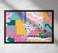 Ein abstraktes Muster kombiniert patchworkartige Farbblöcke mit energiegeladenen Kritzeleien und Streifen und schafft so ein dynamisches, verspieltes und künstlerisches Design.