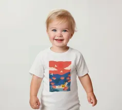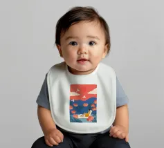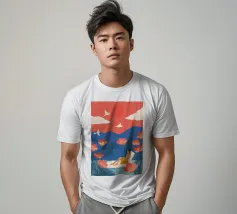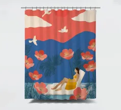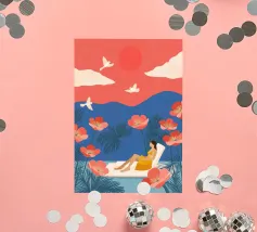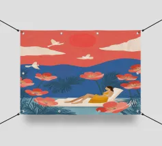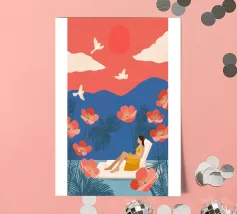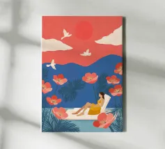 Inmitten von hoch aufragenden Korallenmohnblumen und gefiederten Palmen ruht eine Frau friedlich unter einer kräftigen roten Sonne und schwebt in einem ruhigen Becken. Weiße Vögel segeln über einen traumhaften Himmel und spiegeln die Stille ihrer Haltung wider. Vor dem Hintergrund der indigoblauen Berge und des mandarinenfarbenen Himmels fängt die Szene eine surreale Harmonie zwischen der Natur und sich selbst ein - ein schwebender Moment, in dem die Zeit aufblüht und die Gedanken sich in Farbe und Ruhe auflösen.