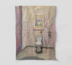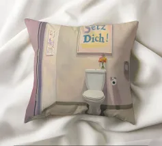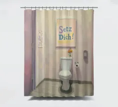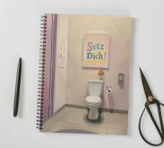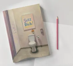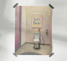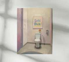 Ein humorvolles Badezimmer-Poster in sanften Pastellfarben mit dem fröhlichen Text „Setz dich“ lädt im Gäste-WC zum Schmunzeln ein. Mit minimalistischer Grafik und Toilettenpapier und handgezeichneten Elementen sorgt es für eine lustige Atmosphäre und eine klare Botschaft gegen das Stehpinkeln!