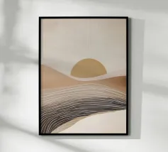 Ein minimalistisches abstraktes Kunstwerk mit einem Dreieck und zwei Kreisen, die im Vintage-Stil übereinandergelegt sind. Umgeben von einem großzügigen weißen Raum, schafft es ein Gefühl von Ruhe und Ausgeglichenheit - perfekt für moderne und skandinavische Innenräume.