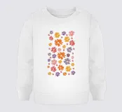 Ein verspieltes Blumenmuster, das wie ein visueller Spaziergang durch ein Retro-Gartenfestival wirkt: Die stilisierten Blüten – in Orange, Pink, Lila, Rot und Gelb – tanzen frei. Jede Blume hat eine einfache, margeritenartige Form mit langen, strahlenförmigen Blütenblättern, die aus einem zentralen Punkt hervorgehen. Die Anordnung ist bewusst unregelmäßig – wie ein Streumuster aus Freude, Sommer und Nostalgie.