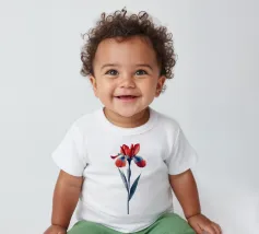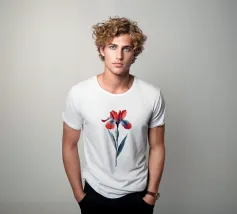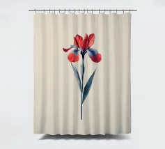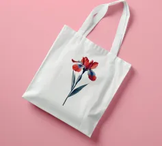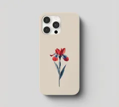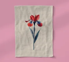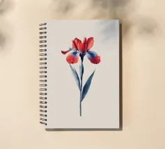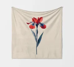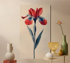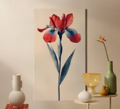 Eine wunderschön detaillierte Illustration einer roten und blauen Irisblüte auf hellem Hintergrund, mit leuchtenden Blütenblättern und weichen, natürlichen Farbverläufen. Der anmutige Stiel und die Blätter verstärken den künstlerischen Reiz.