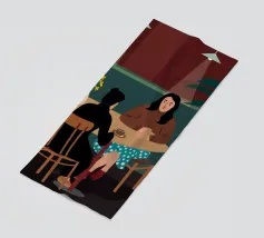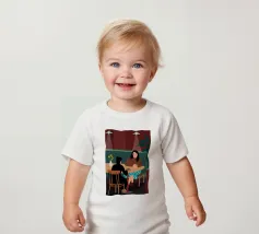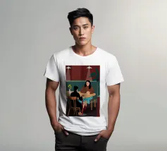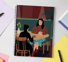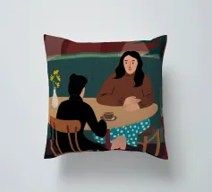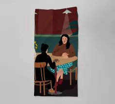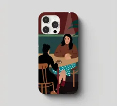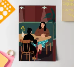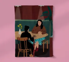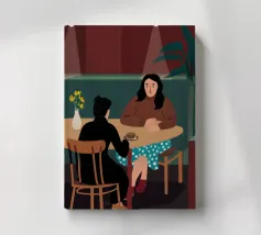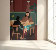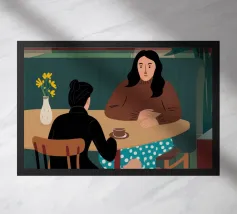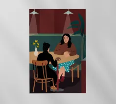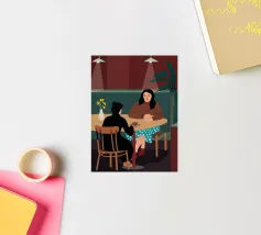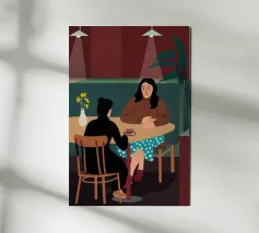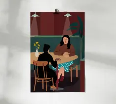 Eine intime Illustration, die einen ruhigen Moment zwischen zwei Personen einfängt, die an einem kleinen Tisch in einem Café sitzen. Die warme, gedämpfte Beleuchtung und ihre konzentrierte Interaktion schaffen eine Erzählung von Konversation und Verbindung, repräsentativ für das moderne gesellschaftliche Leben.