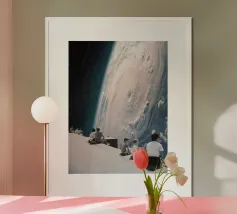 Eine surreale Szene eines einsamen Fischers, der in die Galaxie hinausfährt. Diese ruhige, kontemplative Collage fängt den Frieden der Einsamkeit und die Weite der Gedanken ein. Perfekt für Träumer und Minimalisten.