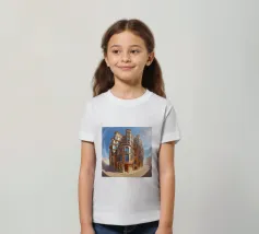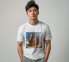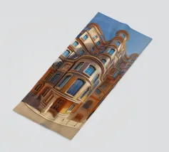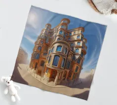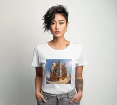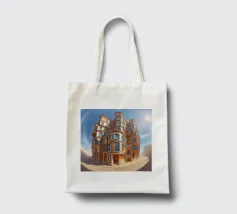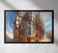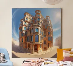 Eine surreale architektonische Struktur mit geschwungenen und verzerrten Merkmalen, die klassische und moderne Stile miteinander verbindet, steht unter einem strahlend blauen Himmel. Die kopfsteingepflasterte Straße und das sanfte Sonnenlicht verstärken die skurrile, traumhafte Atmosphäre.