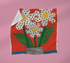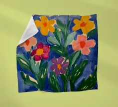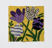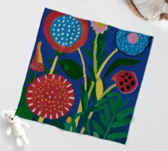 A vibrant, abstract garden scene rendered as a patchwork of dotted and patterned flowers against a dark background. The artwork is a joyful and imaginative interpretation of a blooming garden.