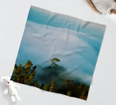 The canopy below is a rich tapestry of greens, swaying subtly in the breeze, while shafts of light break through in places, illuminating patches of woodland in a serene, dreamlike glow.