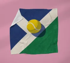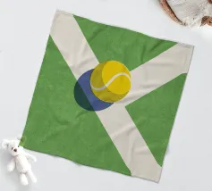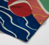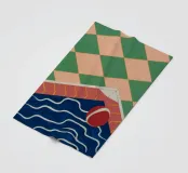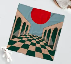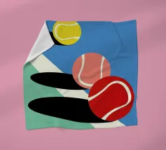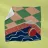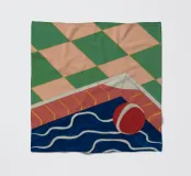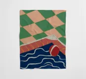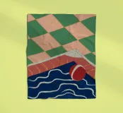 A modern, abstract depiction of a swimming pool with green checkered tiles. A red ball floats on the water, creating a sense of a quiet, sun drenched moment of leisure.