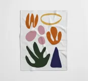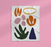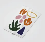 A minimalist abstract composition of various organic shapes in terracotta, blue, and black, floating on a white background, creating a sense of light and balance.