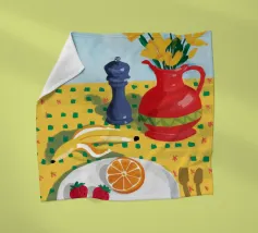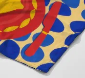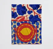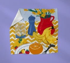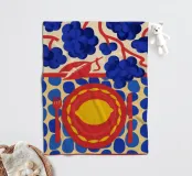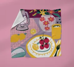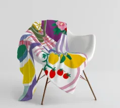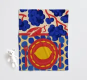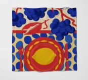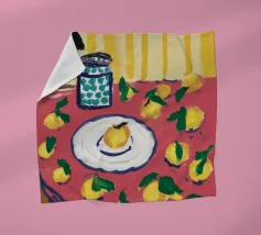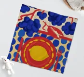 A bold, graphic pattern featuring a lemon sun motif, blue grapes or flowers, and red shapes. The style is modern and has a pop art feel.