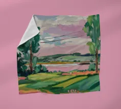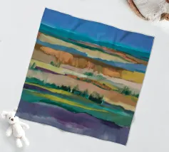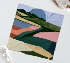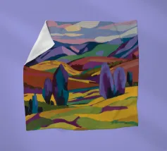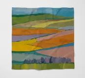 Ein malerischer Blick auf hügelige Patchwork-Felder, die in kräftigen Pastelltönen gehalten sind und eine traumhafte Landschaft schaffen.