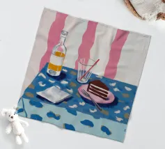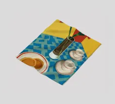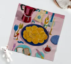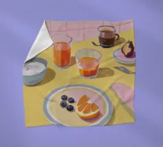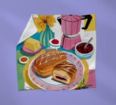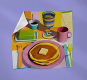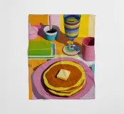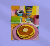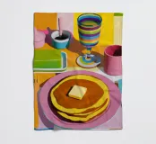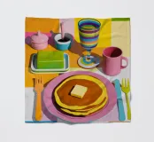 A delicious stack of golden brown pancakes, topped with a melting pat of butter and drizzled with syrup, is the star of this artwork. Presented with colorful mugs, the illustration is a mouth watering celebration of a classic, beloved breakfast treat.