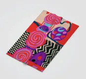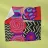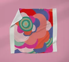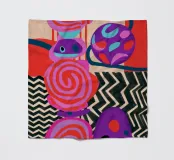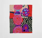 A dynamic abstract composition features bold, rhythmic shapes, spirals, and patterns in a vibrant palette of reds, pinks, blues, and black, creating an energetic and visually stimulating piece.
