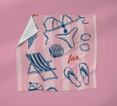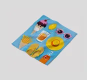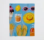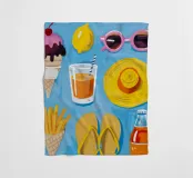 A fun collection of summer items is laid out on a blue background, including ice cream, french fries, sunglasses, flip flops, and a sun hat.