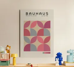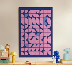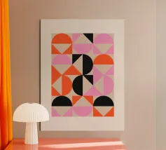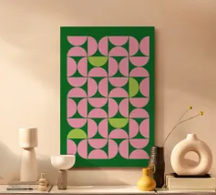 minimalistisches Dekor, Retro-Ästhetik, skandinavischer Stil, kräftiges Farbdesign, Halbkreismuster, moderne Mitte des Jahrhunderts, zeitgenössische Geometrie, farbenfrohe Abstraktion, ästhetische Formen, digitales Musterdesign, trendiger Wohnstil, modernes minimalistisches Muster