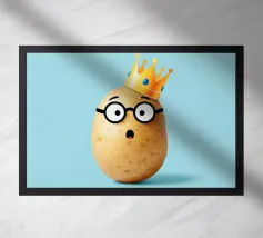 Cartoon illustration of a potato character wearing a cap, comfortably lounging on a green armchair against a vibrant orange background. The relaxed pose and expressive details convey humor and laziness in a lighthearted design.