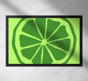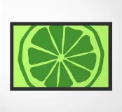 Eine stilisierte grüne Limettenscheibe mit kräftigen, klaren Linien hebt sich von einem helleren grünen Hintergrund ab. Das einfache Design hebt die Segmente und die Schale der Limette hervor.