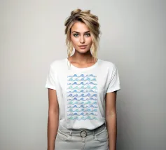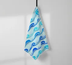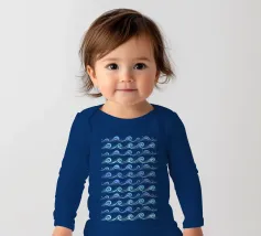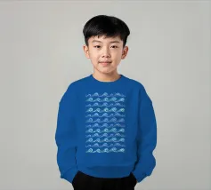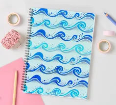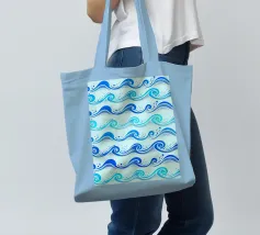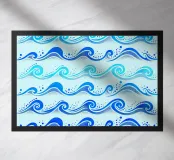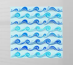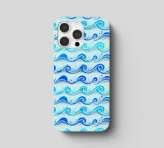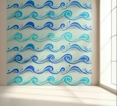 Skurriles aquatisches Küstenmuster mit rollenden Meereswellen in Kobaltblau und Aquablau auf hellblauem Hintergrund.