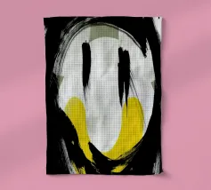 Kühne schwarze Kurven verflechten sich mit einem leuchtenden goldenen Quadrat in der Mitte und schaffen eine dynamische und abstrakte Komposition. Das Zusammenspiel von dunklen und hellen Kontrasten verleiht dem Design Tiefe und Bewegung.