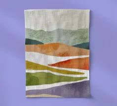 A scenic view of rolling patchwork fields rendered in bold pastels, creating a dreamlike landscape.