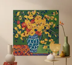 Ein Stillleben mit Zitronen in einer blauen Schale, die auf einem reichhaltigen violetten Tuch ruht. Dahinter steht eine hohe gelbe Vase mit weißen Zweigen vor einem feurig orangefarbenen Hintergrund, der eine kontrastreiche, farbenfrohe Szene erzeugt.
