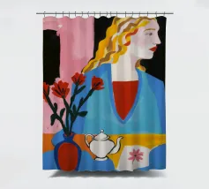 Das Porträt einer Frau mit blondem Haar, gekleidet in Blau und Gelb, die in einem Moment der Ruhe sitzt. Der Stil ist malerisch und modern, mit einem Gefühl der ruhigen Introspektion.