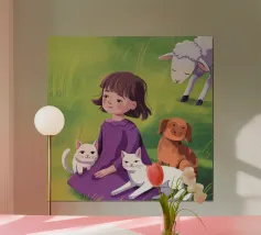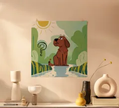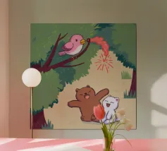 Dieses Kunstwerk zeigt eine mürrisch aussehende Wolke mit einer Gedankenblase, die einen Vogel und einen Bären enthält. Die humorvolle und fantasievolle Szene ist vor einem sanften blauen Hintergrund zu sehen.