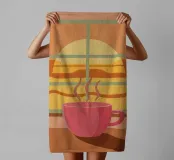 Eine einfache und beruhigende Illustration eines rosa Bechers mit dampfendem, heißem Kaffee oder Tee, der vor einem Fenster mit Blick auf die aufgehende Sonne steht. Die Szene fängt perfekt die Wärme und Hoffnung eines neuen Morgens ein.