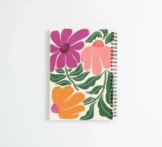 Whimsical abstract daisy blooms in bright pinks and orange hues with lush green foliage.