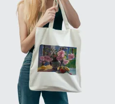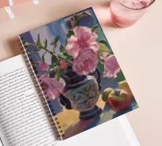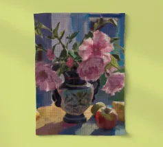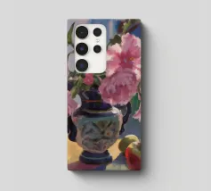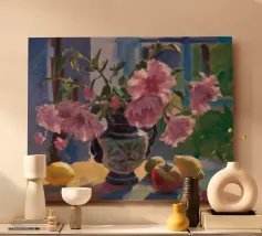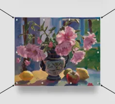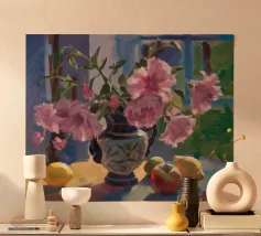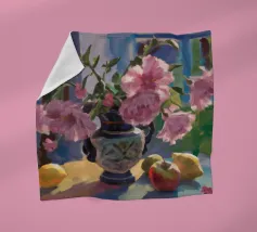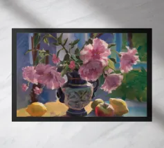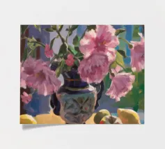 Ein zartes Stilleben mit einem Strauß üppiger rosafarbener Pfingstrosen oder Rosen in einer eleganten blau-weiß gemusterten Vase, begleitet von einer leuchtenden Zitrone und einer anderen Frucht auf einem Tisch, sanft beleuchtet vom Licht aus einem nahe gelegenen Fenster.