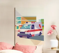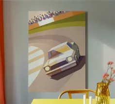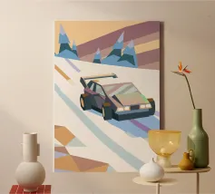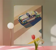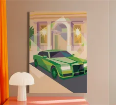 Holen Sie sich eine Illustration eines Oldtimers vor einem historischen Gebäude mit einem modernen geometrischen Stil.