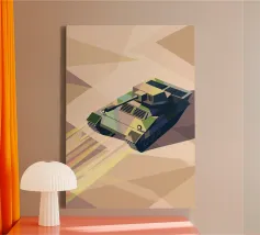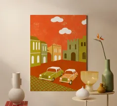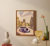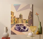 Holen Sie sich eine Illustration eines Oldtimers vor einem historischen Gebäude mit einem modernen geometrischen Stil.