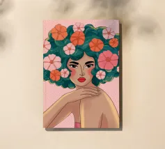 Dieses Gemälde zeigt zwei Personen mit ineinander verschlungenen Haaren und abstrakten Mustern im Hintergrund. Die Verwendung kräftiger Farben und geometrischer Formen schafft ein Gefühl von Einheit und Verschmelzung.