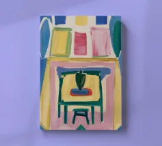 Ein stark stilisiertes und abstraktes Stilleben, das ein Getränk in einem mit Korb umwickelten Glas mit blauem Strohhalm zeigt. Die Szene befindet sich auf einer Fläche mit kräftigen roten und gelben Mustern vor einem strukturierten grünen Hintergrund.
